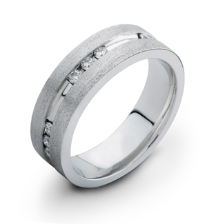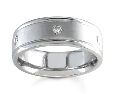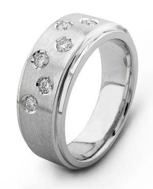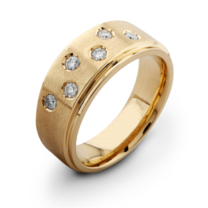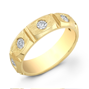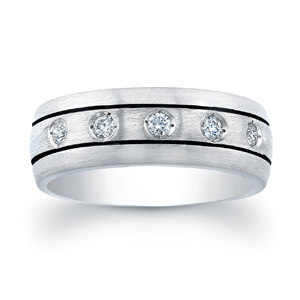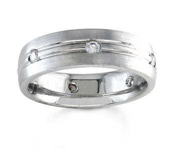 Mens band with 6 round diamonds evenly burnish-set around the band. Diamond weight is 0.25 carats total weight.