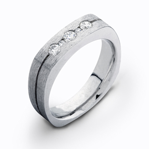 3 Princess cut diamonds burnished into the middle of the ring. An accent line carved thru the middle of the band.