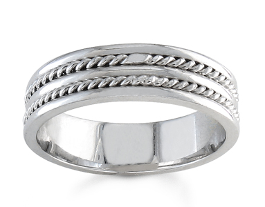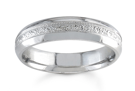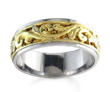 Mens two-two band with a floral pattern going around the center of the ring. Available in all white metal (not shown).
