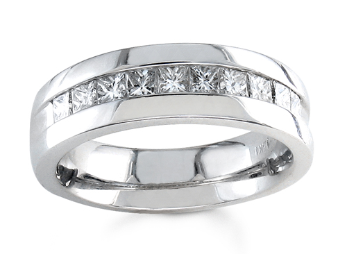 10 Princess cut diamonds channel-set down center of the band. Band is 8mm wide. Diamond weight approximately 1.20 ctw