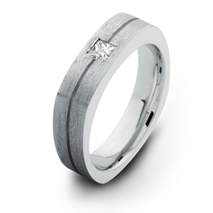 Men's wedding band with one princess cut diamond burnished into the center of the ring.