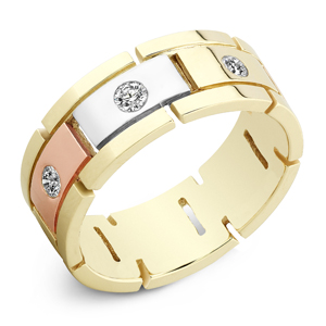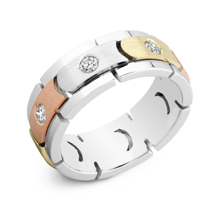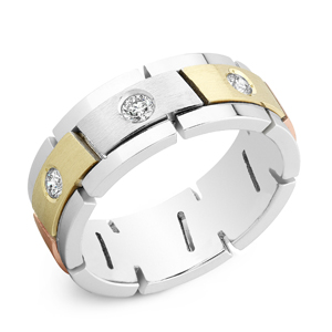 Mens tri-color band with Round diamonds burnished into the ring. Background colors available are white (shown), yellow, or rose gold.