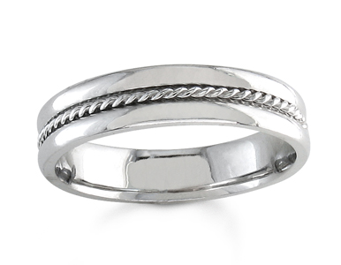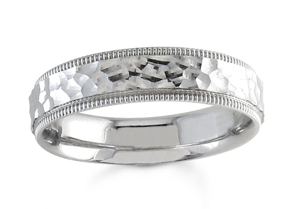 Mens 4mm wide band with hammered pattern in the middle and mill-grain edges.