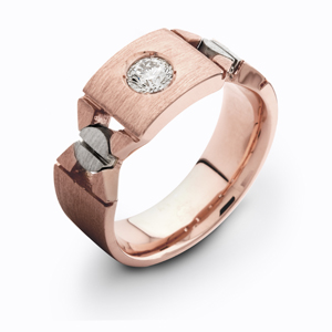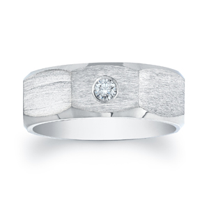 The working man's band! Looks like a lug nut, but this design is high fashion and quite unique. Single round diamond burnished into the band.