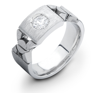 Mens band with single diamond set into center of the ring. Ring has a raised design in the middle area. Center diamond size and shape can vary.