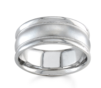 Mens band 8mm wide high polished beveled sides with matte finish center raised design.