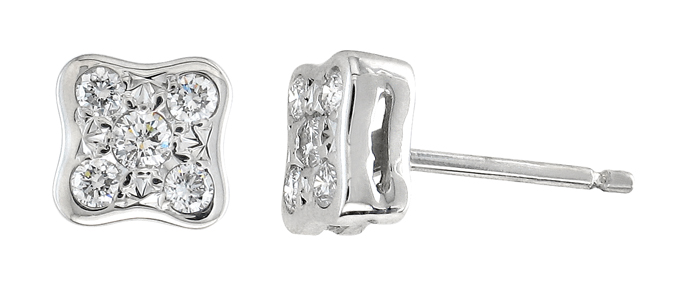 Princess cut diamond studs. This is an illusionary design with 4 smaller princess cut diamonds made to look like one larger princess cut in each ear. Total diamond weight for the pair is 0.45 ctw. Has the appearance of a 1ct diamond.