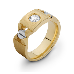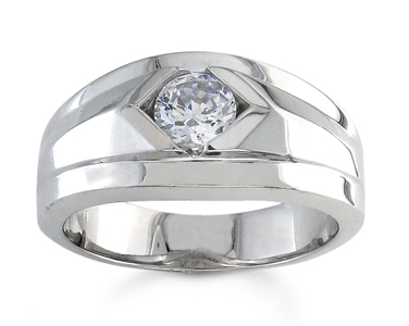Mens band with single diamond set into center of the ring. Ring has a raised design in the middle area. Center diamond size and shape can vary.