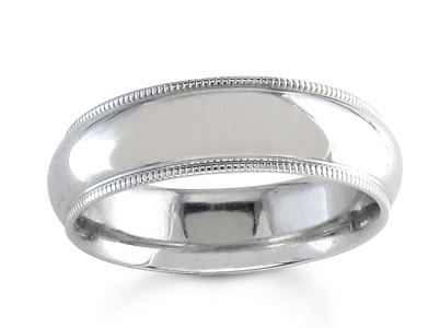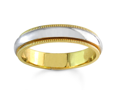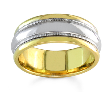 Mens two-tone band with a raised white gold center in high polish and yellow gold side with mill-grain on the edges.