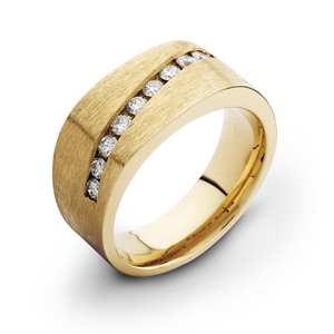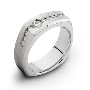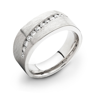 Mens band with 6 round diamonds evenly burnish-set around the band. Diamond weight is 0.25 carats total weight.