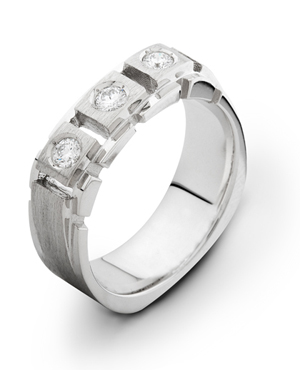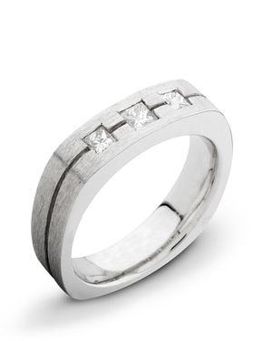 3 Princess cut diamonds burnished into the middle of the ring. An accent line carved thru the middle of the band.