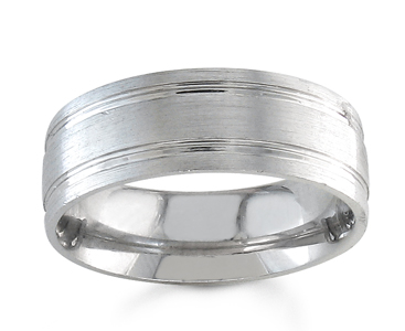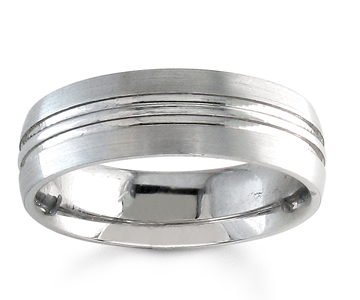 Mens flat brushed metal band with two double-carved designs towards the edge of the ring in high polish finish.
