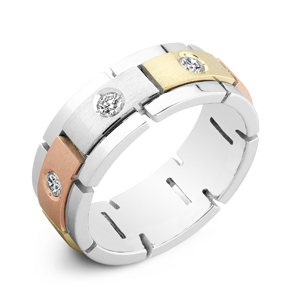 Mens tri-color band with Round diamonds burnished into the ring. Background colors available are white (shown), yellow, or rose gold.