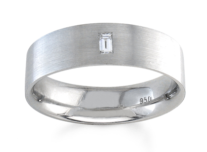 Men's wedding band with one princess cut diamond burnished into the center of the ring.