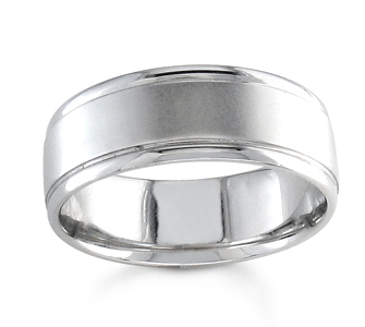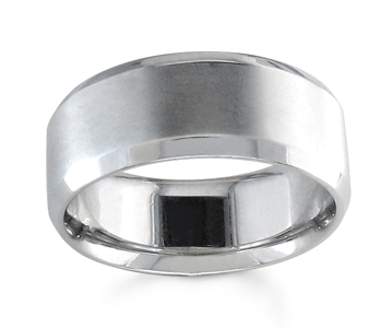 Mens band 8mm wide high polished beveled sides with matte finish center raised design.