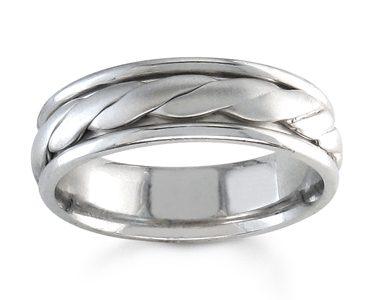 Mens two-two band with a floral pattern going around the center of the ring. Available in all white metal (not shown).