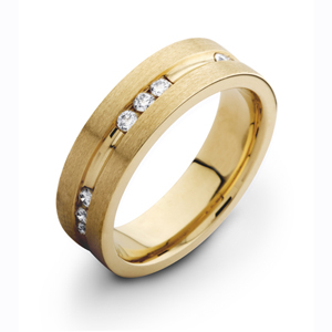 Mens band with 6 Round diamonds burnished into the middle of the ring spaced evenly apart. Two lines carved into the middle of the band going all around the ring.
