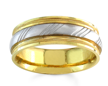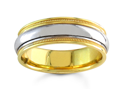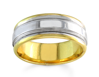 Mens two-tone band with white gold center and mill-grain design. Sides are rolled yellow gold edges.