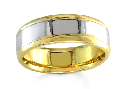 Mens two-tone band with raised center design in white metal and yellow gold edges.