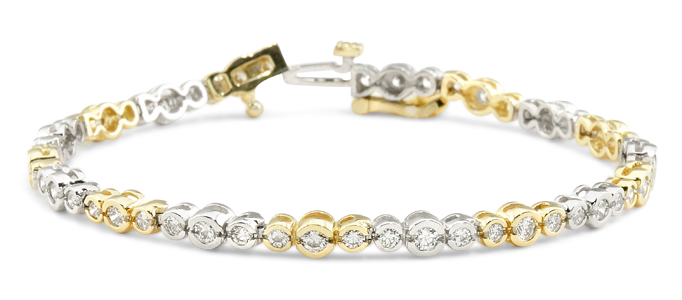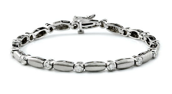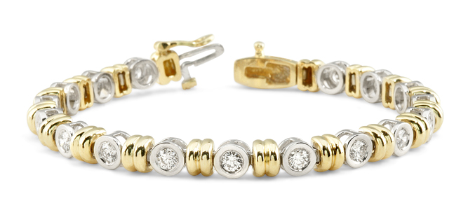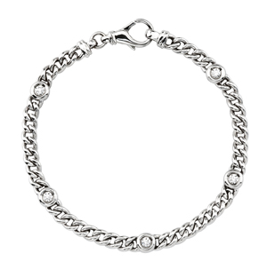 Five (5) Round diamond bezel bracelet. Worn by both men and women. Diamond weight is 0.45 ctw and available with yellow gold links (not shown).