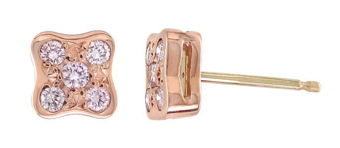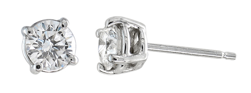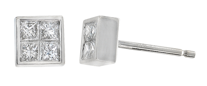 Princess cut diamond studs. This is an illusionary design with 4 smaller princess cut diamonds made to look like one larger princess cut in each ear. Total diamond weight for the pair is 0.45 ctw. Has the appearance of a 1ct diamond.
